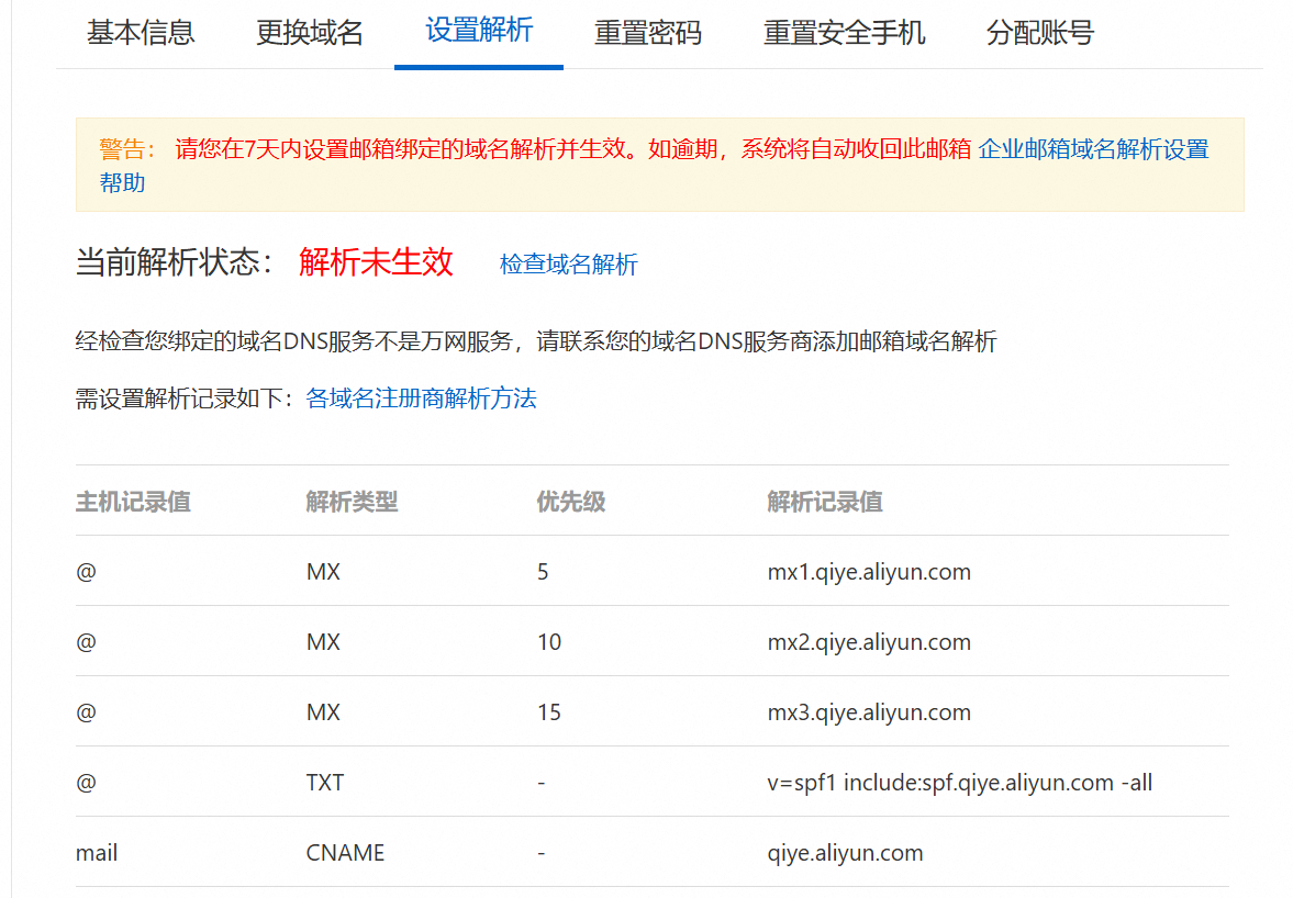 - 点击 设置解析,将阿里云给出的 MX 等记录填入你的域名 DNS 提供商(我的是 Cloudflare)。完成后等待 DNS 记录的传播,然后点击 检查域名解析,如果出来的是绿色的解析已生效,证明你的 DNS 记录添加成功。
