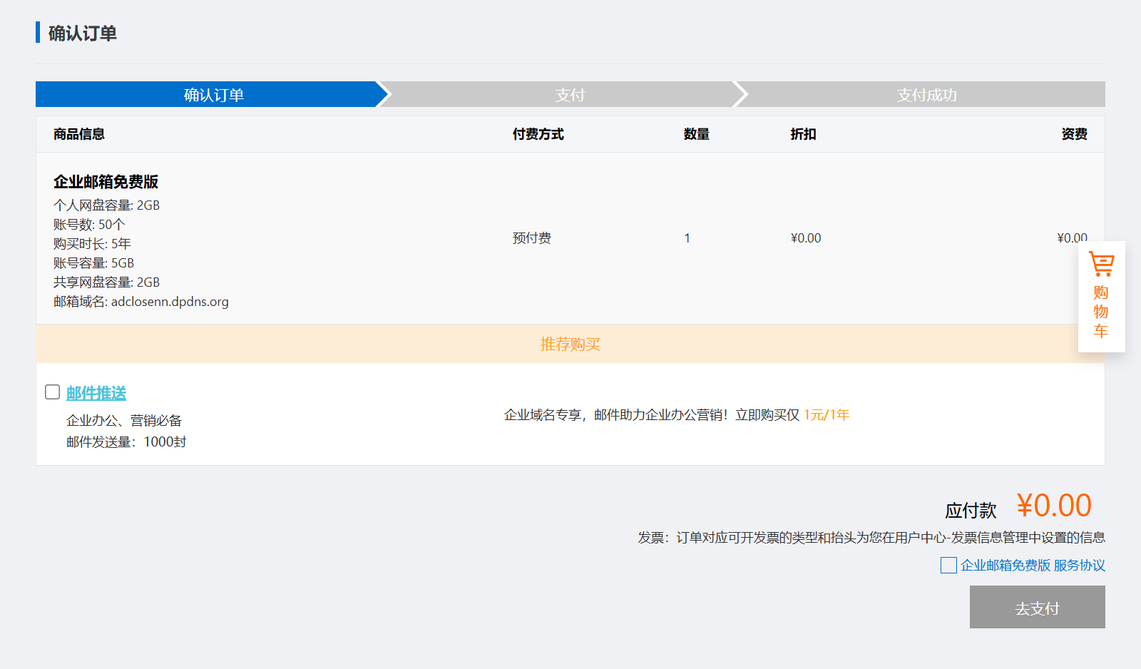 - 如果你要纯免费,请不要勾选 邮件推送(默认未勾选)。阅读完 企业邮箱免费版 服务协议 后,勾选它,并点击 去支付。